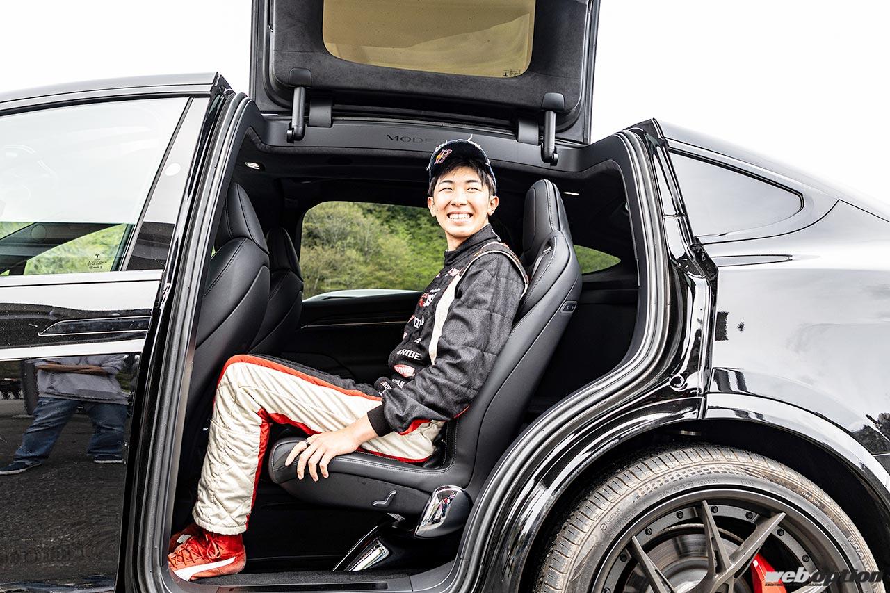試乗を終え、降りてきた箕輪選手は満面の笑顔で「…いや、このクルマはヤバいですね! 加速感が異次元で、100km/hまで一瞬。エンジンとは出力特性が違いすぎて、もう本当にビックリです! 将来的には、こういったハイパワーなEV車両でドリフトマシンが作れたらすごく楽しそうだなと思いましたね」と話してくれた。