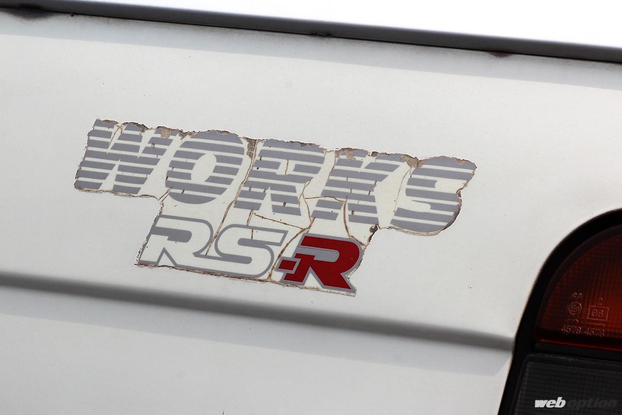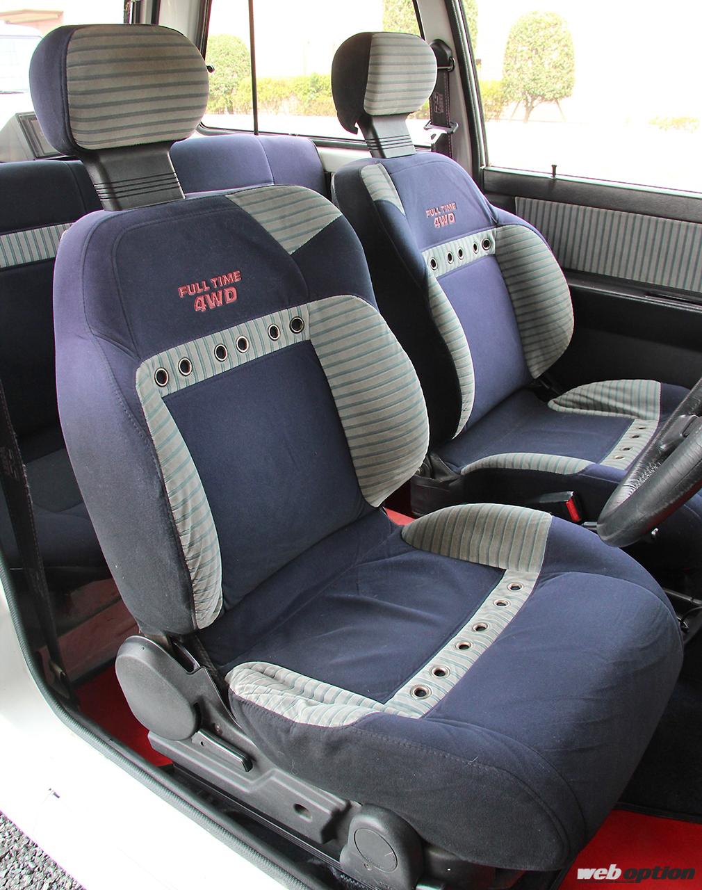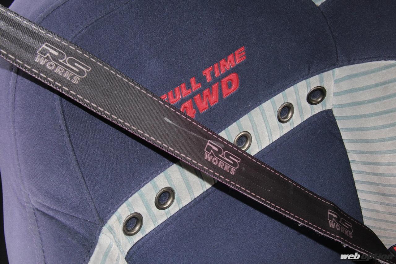 “RS WORKS”のロゴが入った専用シートベルト。病的とも思えるくらいの拘りが変態的だ。シート背もたれには“FULL TIME 4WD”のロゴも確認できる。