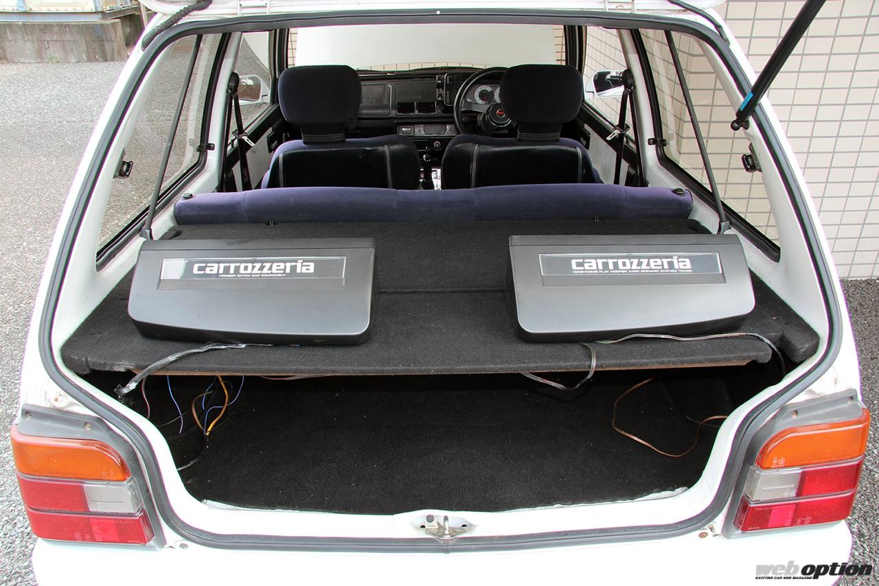 カロッツェリア3ウェイ据え置き型スピーカー装着のため、脱着式パーセルボードを使用。リヤゲートを支えるダンパーは、実は右側にしか設けられてなかったりする。