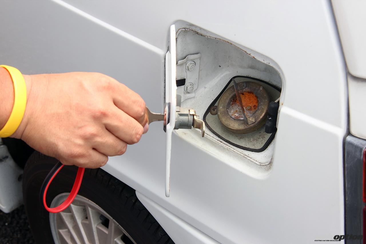 給油口はキーで開閉する昔ながらの方法。室内からレバー操作ひとつで開けられるオープナーなど、贅沢な装備は省かれている。