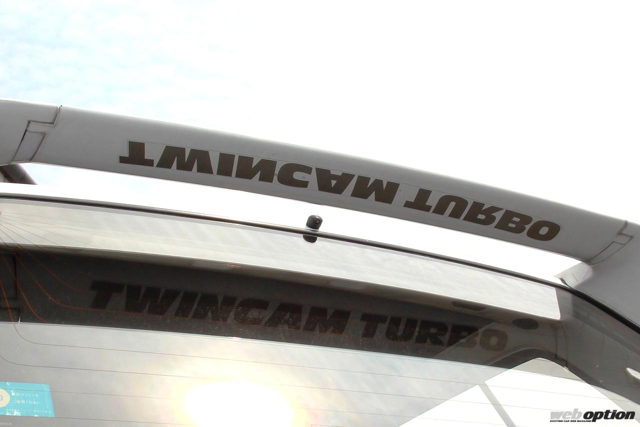 リヤウインドウを取り囲むように装着されるルーフエンドスポイラー。ウイング下面に“TWINCAM TURBO”と逆さ文字が入っているとは知らなかった。それがリヤウインドウに映り込むと正位置で読めるのだ。