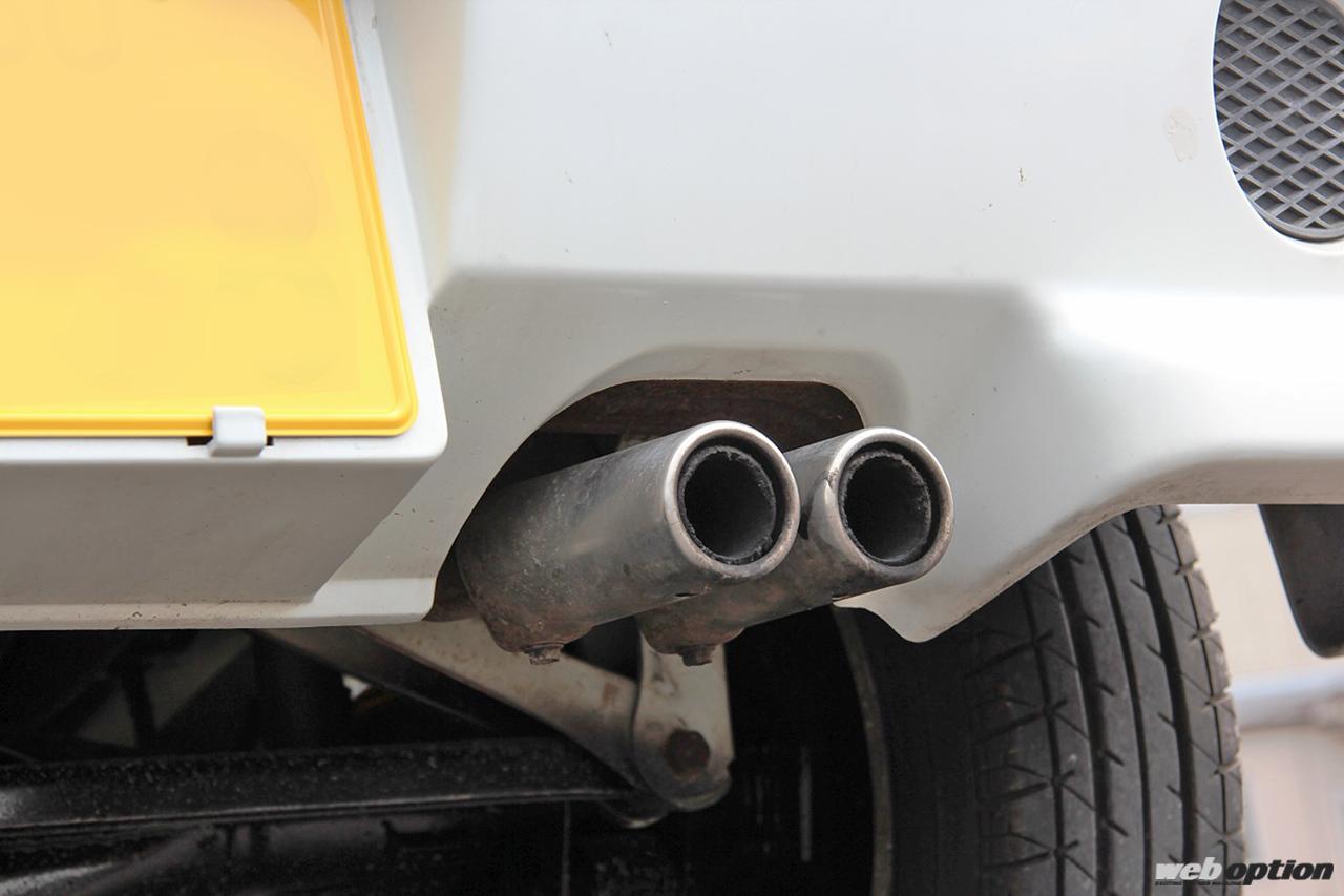マフラーはデュアルテール仕様。この時代の軽4ナンバー車は触媒レスが基本のため、アイドリング時の排気ガスがやたらと臭かったりする。さらに、排気抵抗になるものが存在しないとなれば、ブーストアップ時のパワー向上幅も当然大きい。