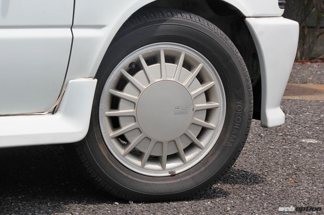 ホイールが貴重な純正アルミ仕様だ。軽さと剛性の両立のため、異形断面リムにディスク部を組み合わせた2ピース構造を採用する。タイヤは標準より1サイズ太い155/65R13のヨコハマA200を装着。