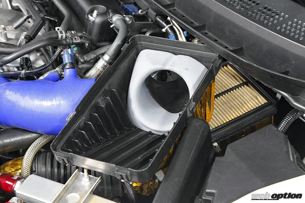 純正エアクリボックス内に装着するのは、オリジナルのレーシングファンネル。ファンネル効果で広範囲から効率よく吸入することが可能で、シャーシダイナモでは全域でのパワーアップを確認できたそうだ。