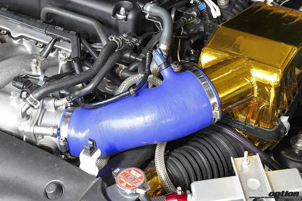 内部に凹凸がある蛇腹の純正パイプに対し、抵抗のないスムーズな流入を狙って製作されたオリジナルサクションパイプ。5プライのシリコンホースが使用されていて、変形が少なく、熱害の影響も受けにくい設計となっている。