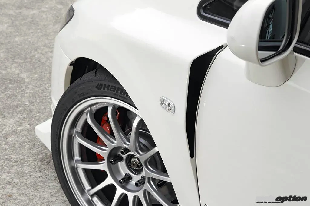 タイヤはヴェンタスR-S3(F255/35-18 R235/40-18)を選択。ワイドタイヤ&ローインセットのホイール(SSRタイプF:F9.5J+40 R9.0J+50)を履きこなすべく、わざわざフロントワイドフェンダーを製作した。