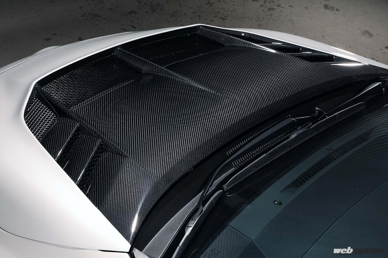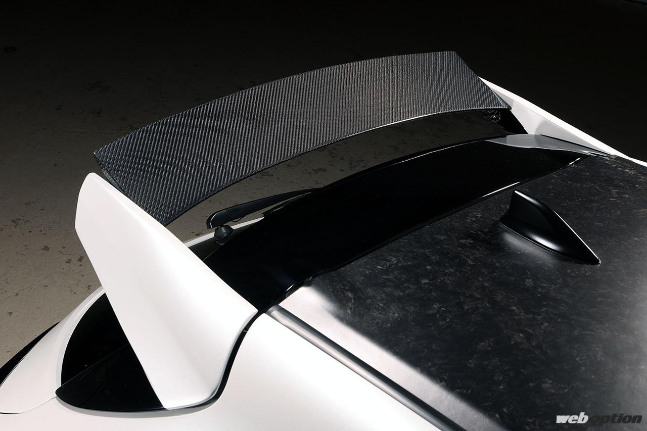 3段階の角度調整できるリヤウイング(19万8000円)。FRP素材の左右ウイングベースと、カーボン素材のウイング本体からなる3ピース構造だ。