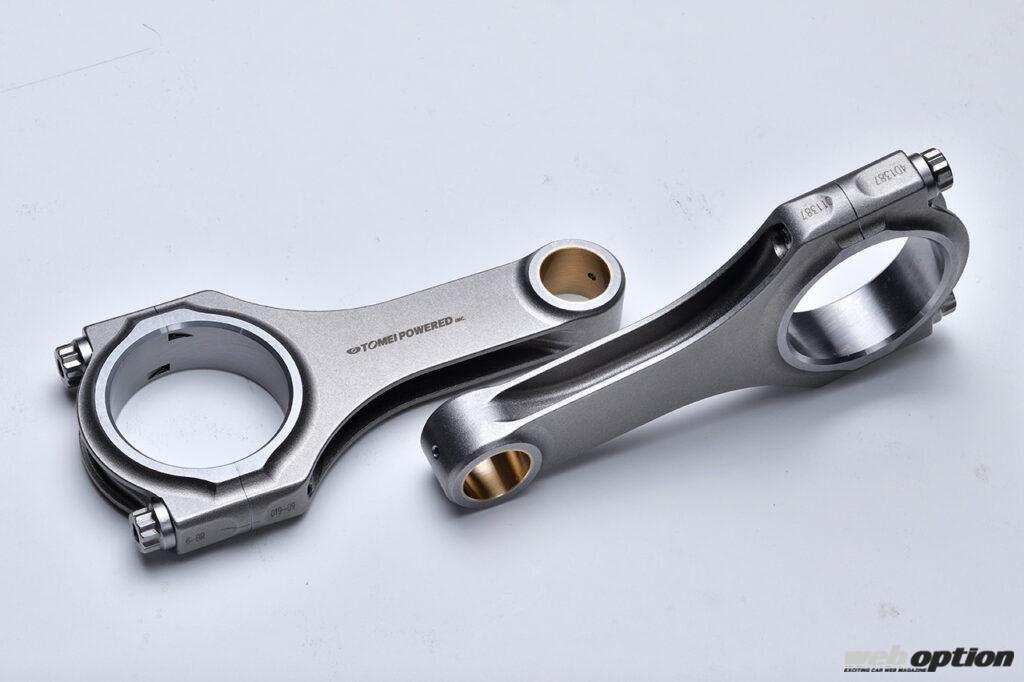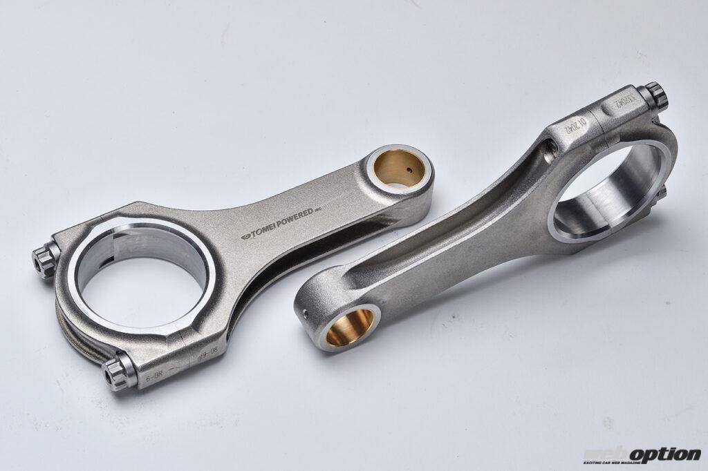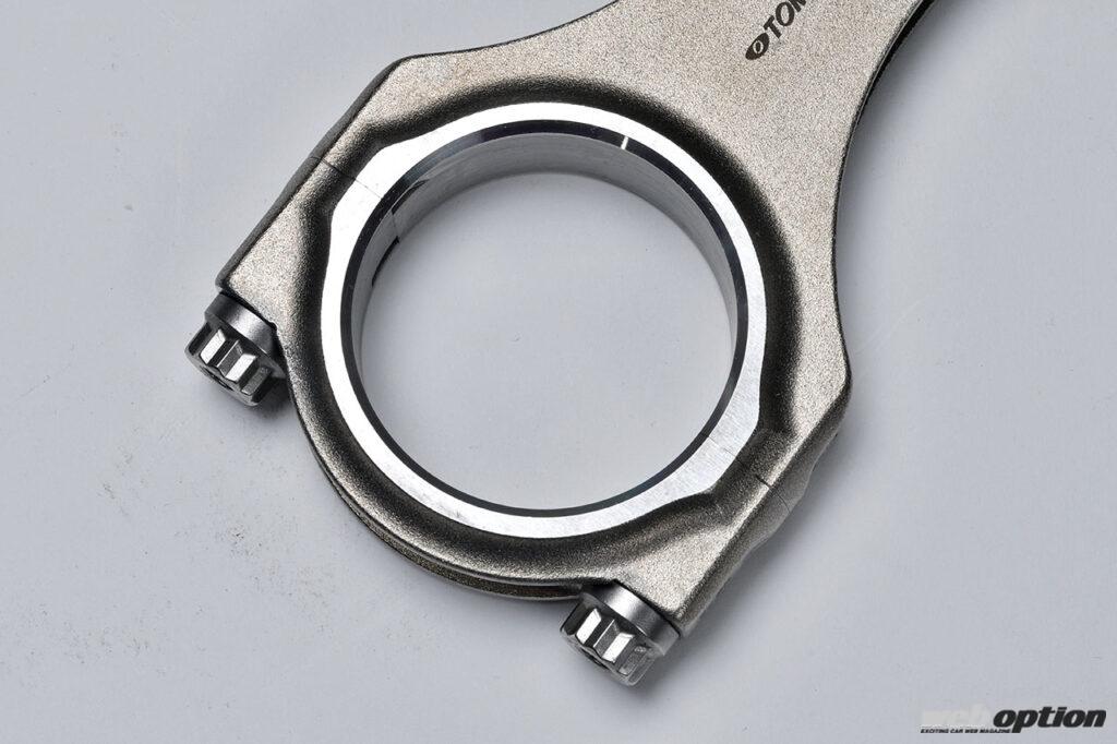 RB26&RB25用コンロッドの中心距離は121.5mm。SNCM439材を採用し、重量を抑えながら高い座屈強度を確保するためにH断面形状としている。また、ロッドとキャップ部の合わせ面の面積を大きく取ることで結合強度をアップ。大端部の変形を抑えているのも特徴だ。さらに、小端部の上方にオイル穴を設けてオイルを効率よく取り込む構造に。ロッド部の疲労強度を高めている。コンロッドボルトはARP製。引張応力に耐えられる特殊鋼を採用した独自形状となっている。