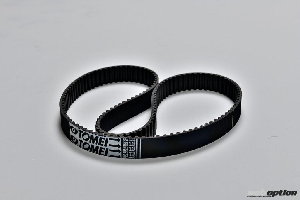 過酷な状況下に晒されるタイミングベルト。ハイカムや強化バルブスプリングを組み込んだチューニングエンジンでは、さらに条件は厳しくなる。東名パワードの強化タイミングベルトは、素材の最適化により強度を高めた上に、高温時の引っ張り強度を高めるべくケブラー繊維を織り込むなどして耐久性を向上。寿命は2倍以上となっており、安定したベルト駆動を実現する。RB20やRB25にも適合する。