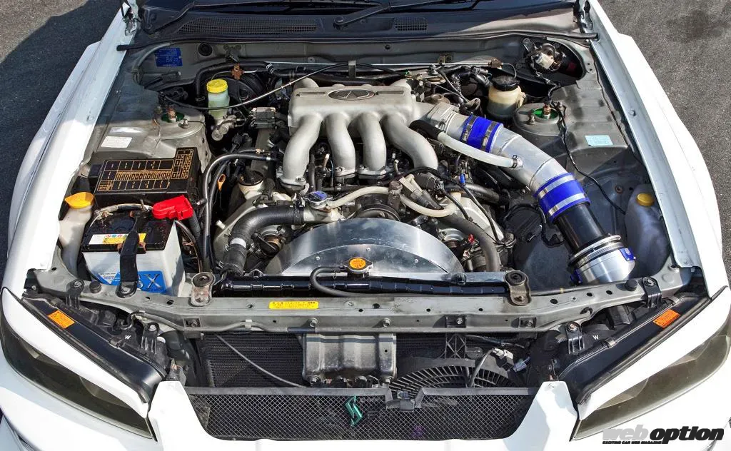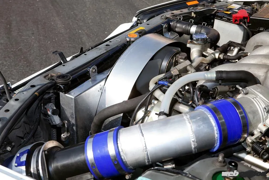 ただし、V8エンジン搭載による発熱量の増加に対処するため、ラジエターをER34用の2層式に変更しつつアルミ製シュラウドで覆って冷却性能を高めている。また、エンジンの高さも適正範囲。ボンネット裏のインシュレーターと干渉することもなく、これがストック状態と言っても気づかない気もする…。