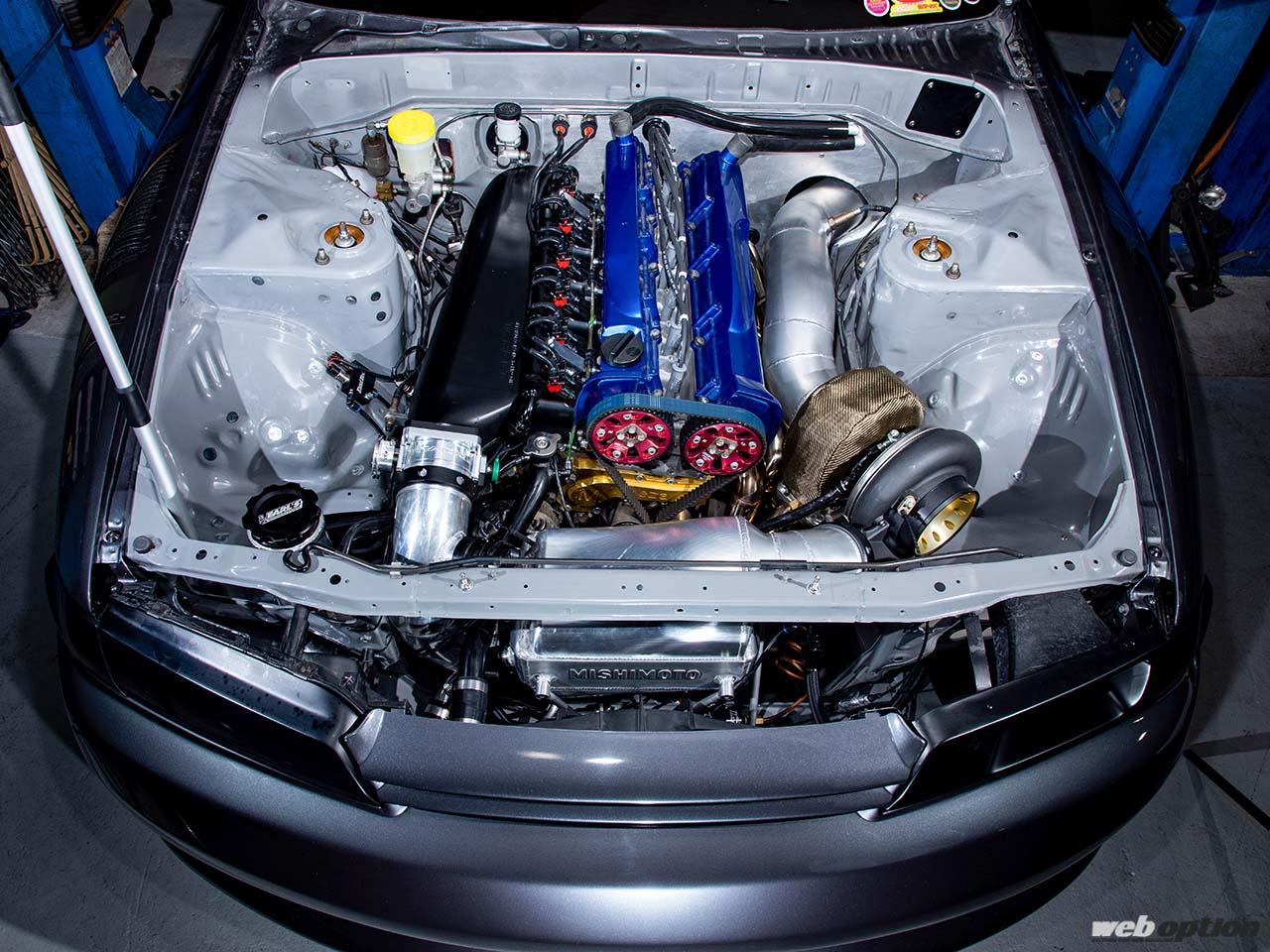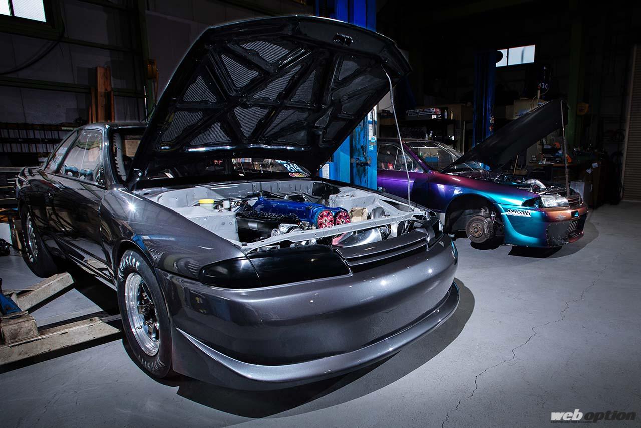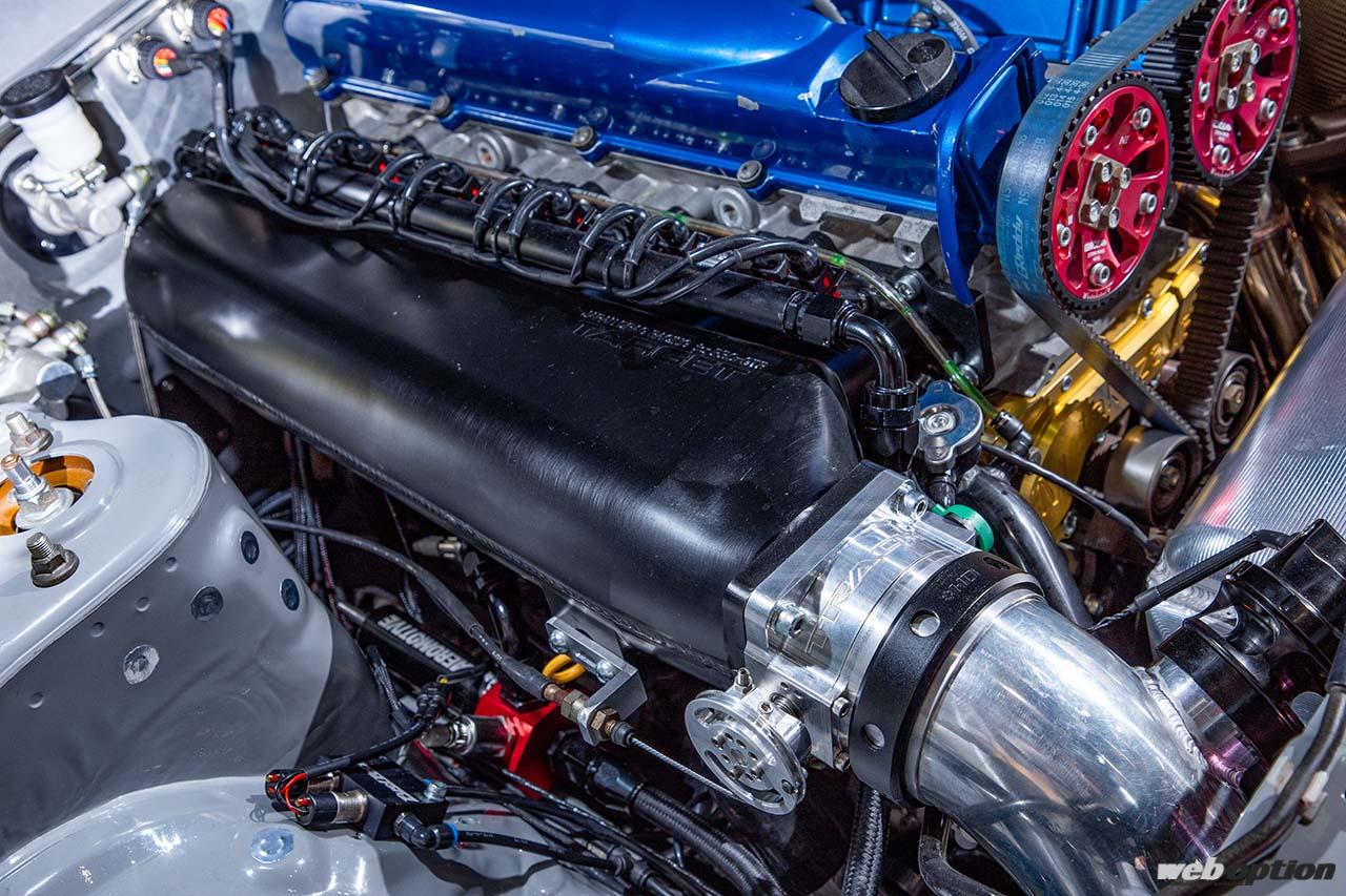 ベースとなるのは、ニスモ製「24U」ブロック。内部にセメントを充填し、剛性を強化。クランクはHKSステップ2を採用し、ピストン&コンロッドもHKS製で、排気量は2.8Lに拡大。タービンにはHKS GT75115BBシングルを組み合わせ、シェイクダウン時にはブースト2.4キロで1200psを記録。最大で3.5キロまで対応できるスペックだ。