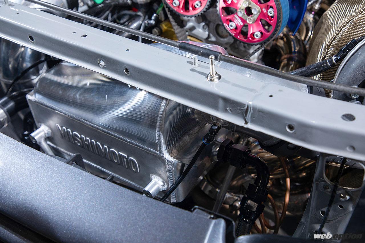 インタークーラーは水冷式で、MISHIMOTOのコアを使用。ブロック直前に設置され、タンク類はターゲットによるビレット削り出し。ラジエターは軽量化を狙い、トラスト製の36系アルト用を採用している。