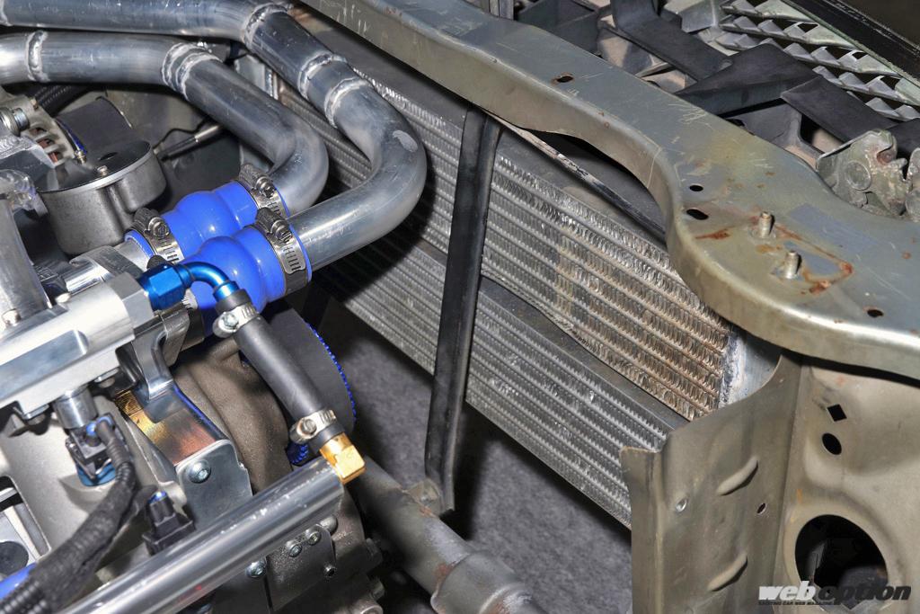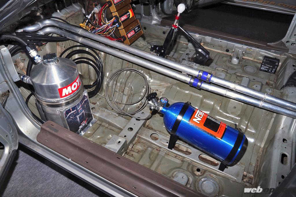 助手席を貫いてレイアウトされる2本のパイプは、エンジンからリヤのラジエターを繋ぐウォーターライン。助手席に確認できる物体は、ドライサンプ用の大型オイルタンクとNOSボンベだ。