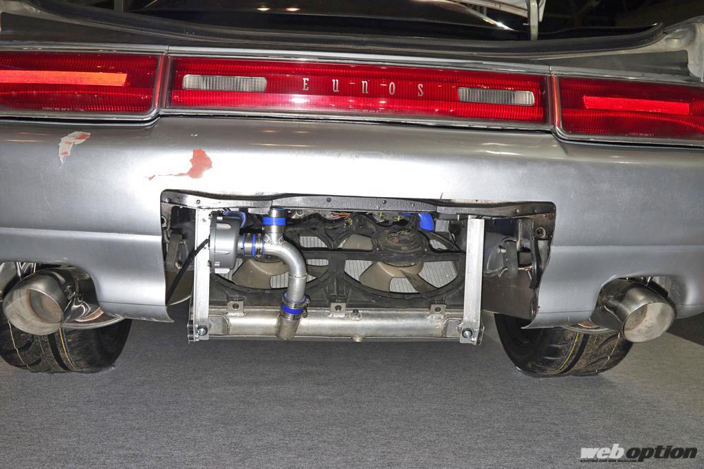 オイル潤滑システムはドライサンプ方式で、フロントバンパー内には巨大なオイルクーラーを装備。エンジンルームの大きさで選んだというユーノスコスモをもってしてもフロントにラジエターを収めることはできず、リヤバンパー内にマウントすることになった。