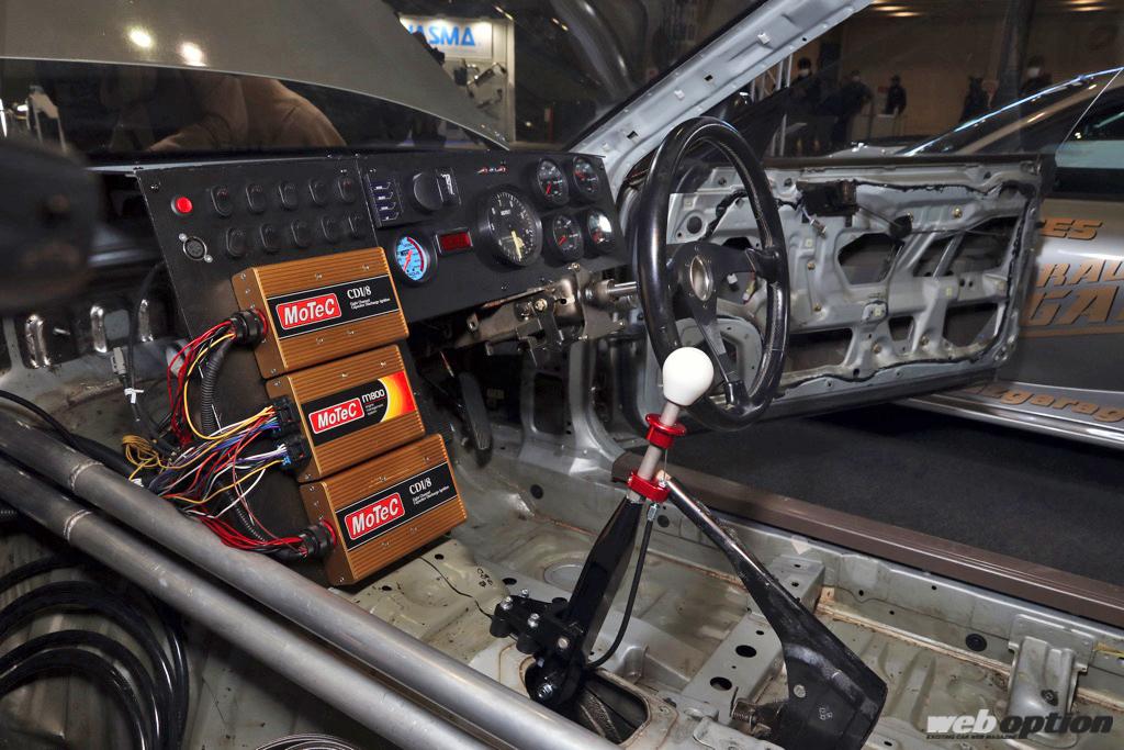 センターコンソールにマウントされているのは、エンジンマネージメントを司るモーテックのM800と同じく点火用のCDIシステムだ。トランスミッションはOS技研の5速シーケンシャルドグ、メーター周りは永井電子の大型タコメーターを中心に、トラストシリウスメーター(油圧、油温、水温、燃圧)、NGKの空燃比計を装着している。