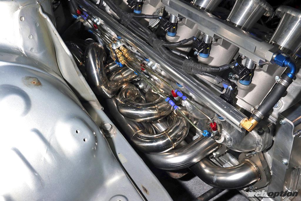 燃料供給方式は、TWM製6連スロットルによるインジェクション仕様で、インテークポートにはNOSもセットされる。とぐろを巻くように取り回されていエキゾーストマニホールドはワンオフで製作したものだ。
