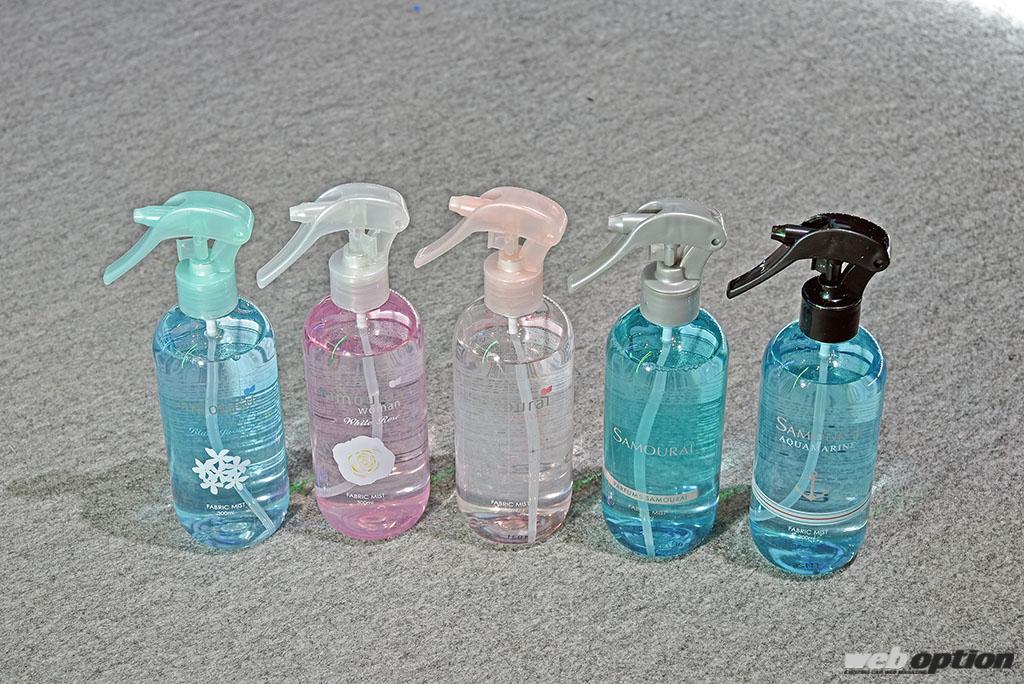 また、昨今のコロナ渦でクルマでも必需装備となりつつ“ファブリックミスト”も設定。シートやドア内張にひと吹きするだけで、サムライの香りとともに、消臭、防臭、除菌効果が得られるのだ。ちなみに、衣類にはシワ伸ばし効果も発揮してくれるという。