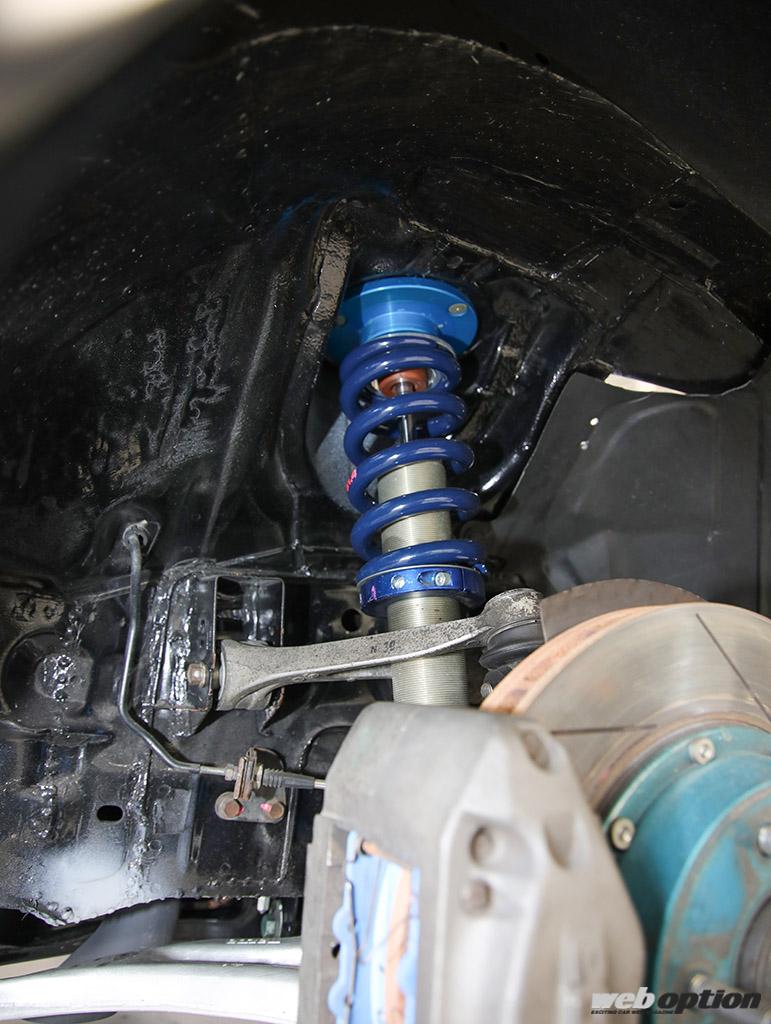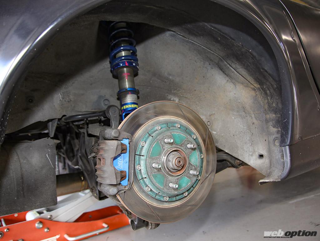 足回りはビルシュタインの車高調を軸にセットアップ。アッパーアーム取り付け部加工によるジオメトリーの変更など、細かく手が入れられている。