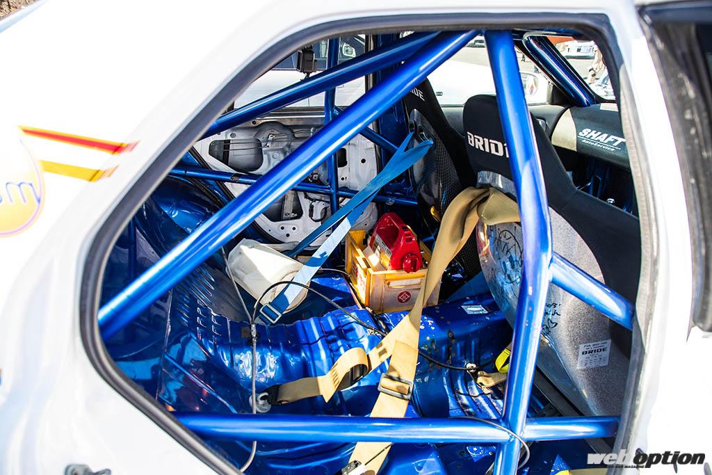 ボディは無駄なパネル類をカットしながら、プレート補強やスポット増し、フル溶接ロールケージ等、レーシングカーさながらの剛性アップ術を敢行。室内は鮮やかなキャンディブルーでペイントされ、非常に美しい仕上がりだ。ミッションはスープラ純正のゲトラグ6速、サイドブレーキの油圧化も敢行されている。
