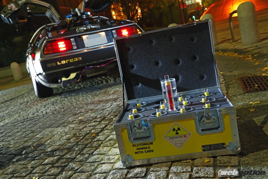 劇中で、ドクがリビアのテロリストから奪取したタイムマシン用のプルトニウムと専用ケースも再現。ケースは海外で再販されたものを購入し、そこに自作のステッカーを劇中と同じ位置に貼っている。プルトニウムはオーナーによるDIY作品だ。
