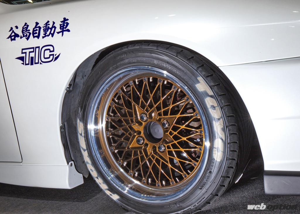 バケットシート同様に、ホイールもあえて旧車テイストのSSRメッシュをマッチングした。サイズは16インチでフロント8.0Jのリヤ9.0Jだ。足回りはビルズの全長調整式車高調をセレクトして適度にローダウン。