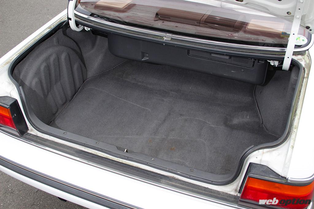 スペアタイヤを左側に立てかけることで深さを稼いだトランクルーム。見ての通り容量は申し分なく、バンパー上部から開くトランクリッドと合わせて使い勝手にも優れる。スピーカーボードの裏側に見えるのは空気清浄器のフィルター。