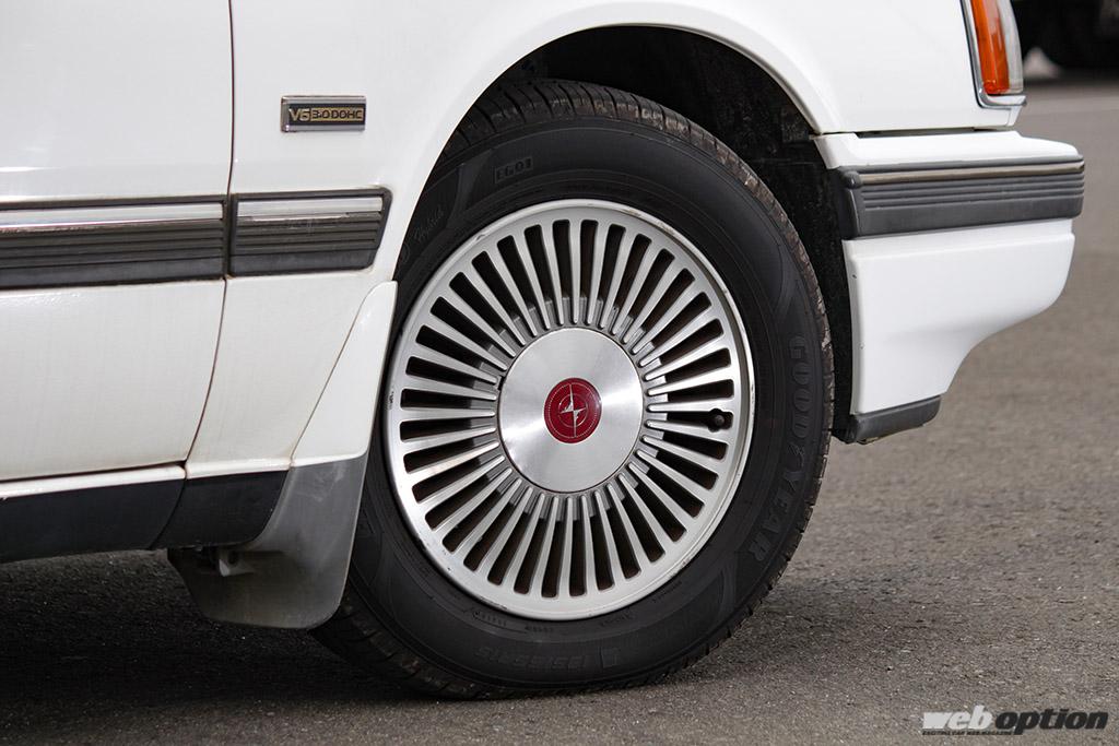 光沢感のある細いフィンタイプのスポークが、足元をエレガントに見せる純正アルミホイール。タイヤはグッドイヤーEG01で、標準サイズの195/65R15を履く。フロントフェンダー後方には“V6 3.0DOHC”のエンブレムも。