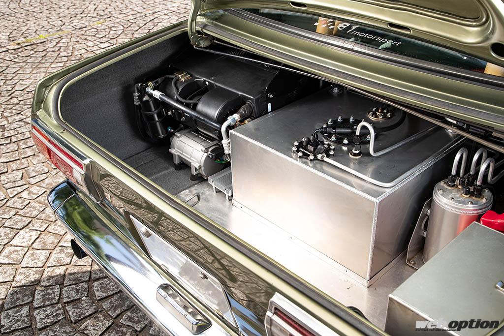 ちなみに、平野カメラマンのブルーバードはエンジンベイを追求した結果、エアコンシステムはリヤのトランク内で完結させていたりする。システムの要となる電動コンプレッサーユニットは省スペース設計のため、置き場所に困ることもない。