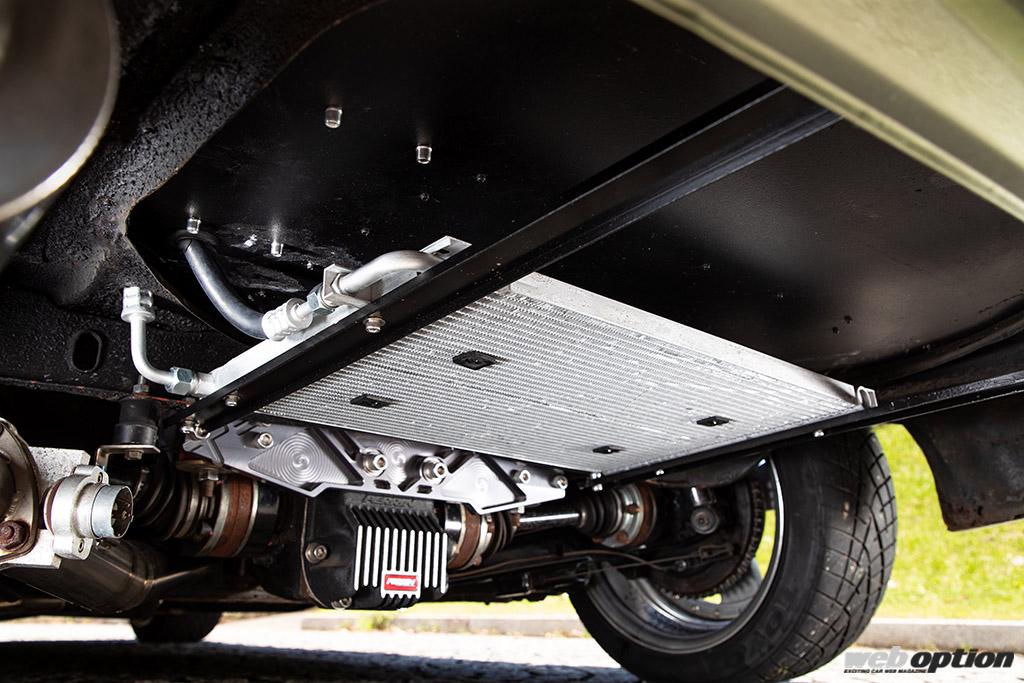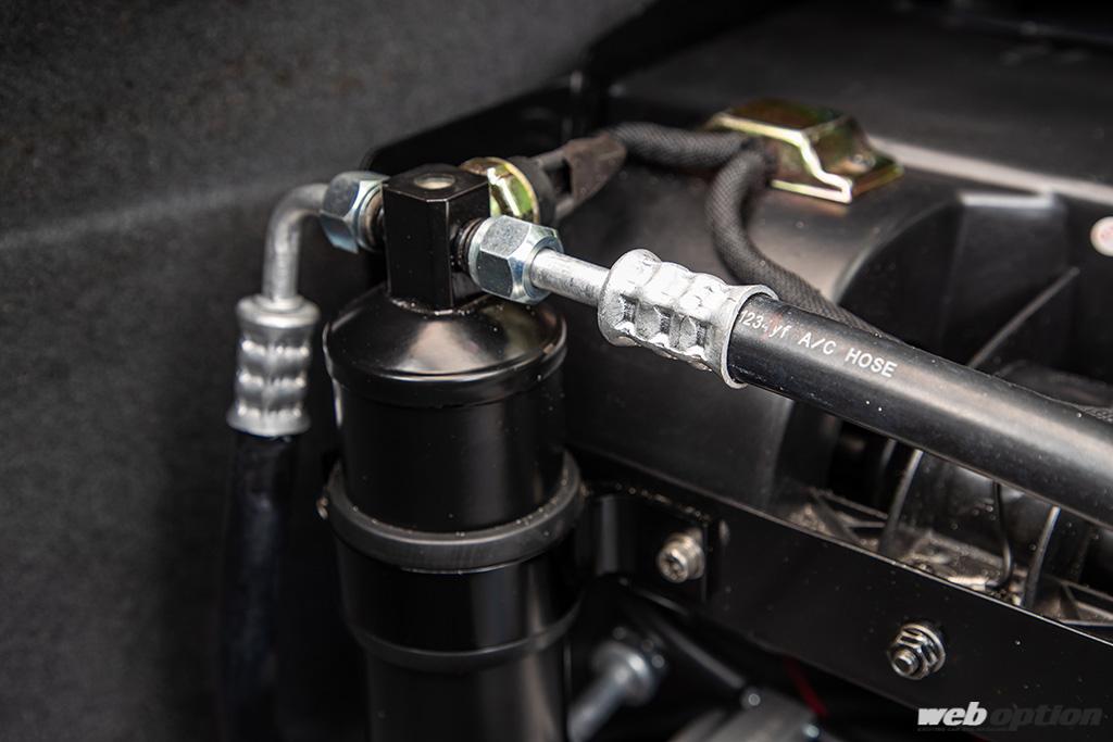 エアコンコンデンサーは、一般的なフロントではなくリヤ下部に水平マウント。エンジンの熱害を受けないので、想像以上に冷却性能は高いと平野カメラマンは語る。