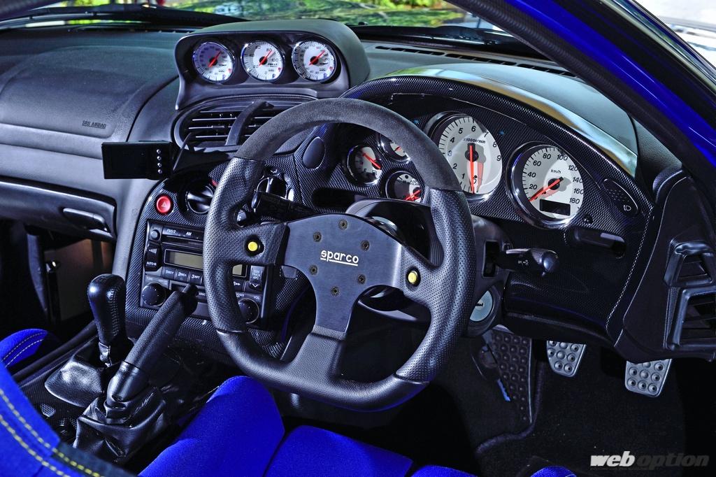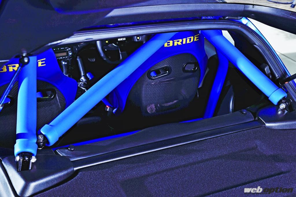 室内はストリート然とした仕上がり。ダッシュ上には3連の追加メーターが並び、ロールケージが覆い尽くす。シートはブリッドのカーボンバケットで、ロールケージのバーパッドを含めてブルーカラーで統一している。