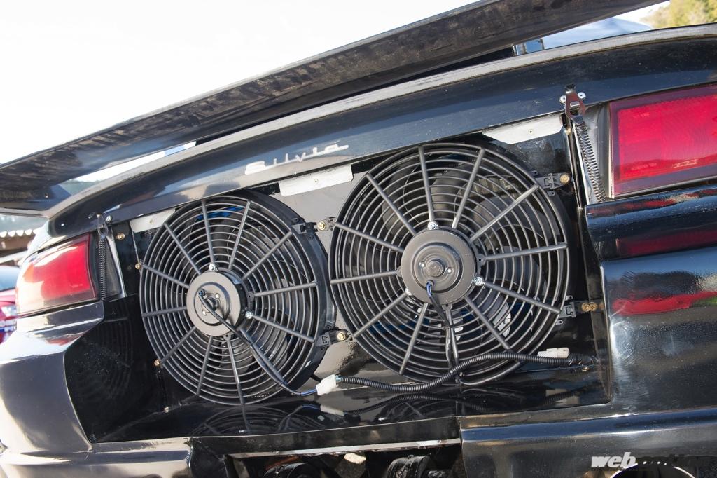 重量配分を考慮し、ラジエターはリヤに設置。大型のFRPリヤカウルに設けられた4つのインレットダクトからフレッシュエアを取り込み、コア背面の電動ファン(引き抜き用)で後方へと強制排出する仕組みだ。
