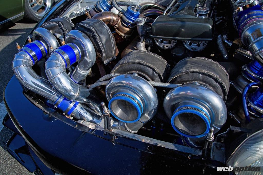 おかしい。明らかにフォルムがおかしい。エンジンルームもおかしい。大型タービンが沢山…。このシルビアは栃木県のチューニングショップ“キャロラインレーシング”の渡辺拓郎代表が2015年に作り上げた超大作、男なら誰もが憧れるであろうオーバー1000馬力の夢を、信じられない手法で成し遂げてしまった渾身のスーパーチューンドなのである。(1&2JZ Technical Handbook and DVD Vol.2より抜粋)