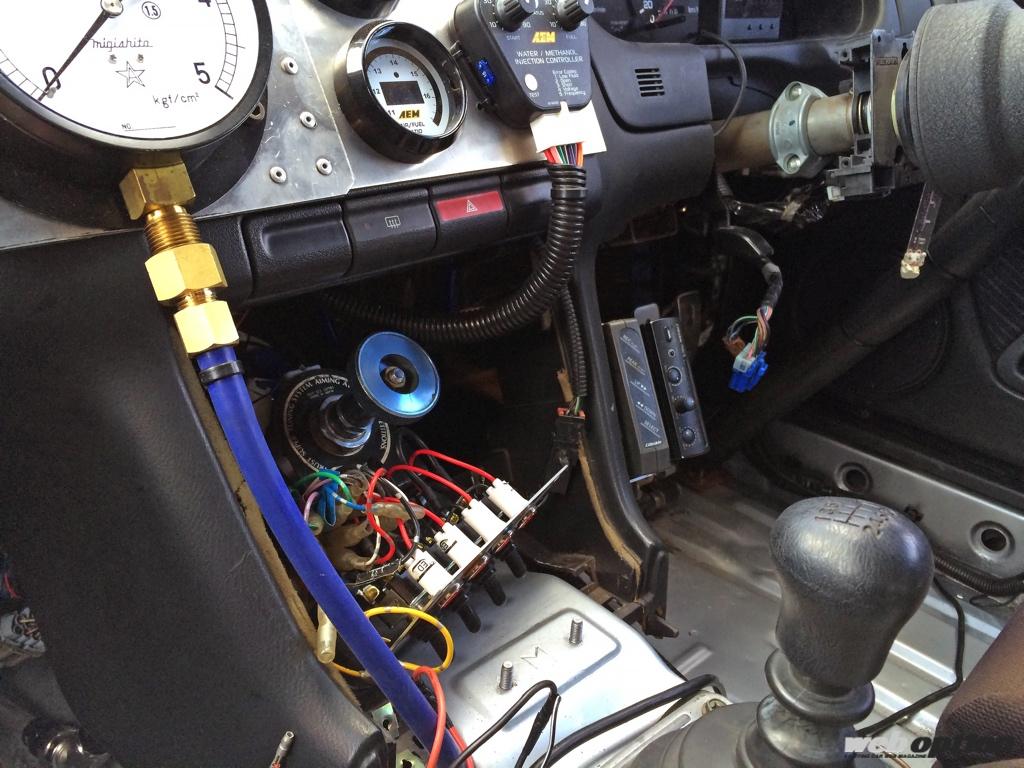追加メーターがズラリと並ぶレーシーなインテリア。ブーストメーターは工業用の機械式だ。ペダル類はチルトンのオルガン式がセットされる。リヤにはNOSのタンクとウォーターメタノール用のタンクが設置され、さらにオリジナルの燃料ラインが通る。