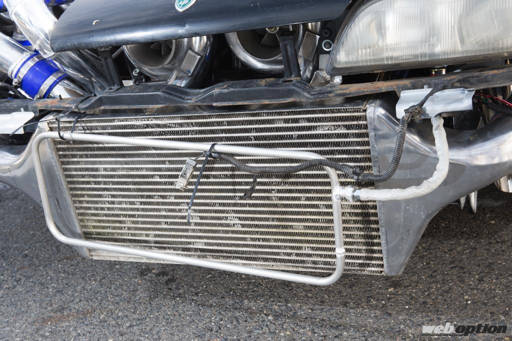 インタークーラー&ラジエターにはN2O噴射用のシャワー式ノズルを設置。噴射制御はモーテックM4が担い、吸気温度や水温、速度など細かな条件が設定されている。NOSでコアを凍らせるというわけだが、これはドラッグマシンの発想だ。