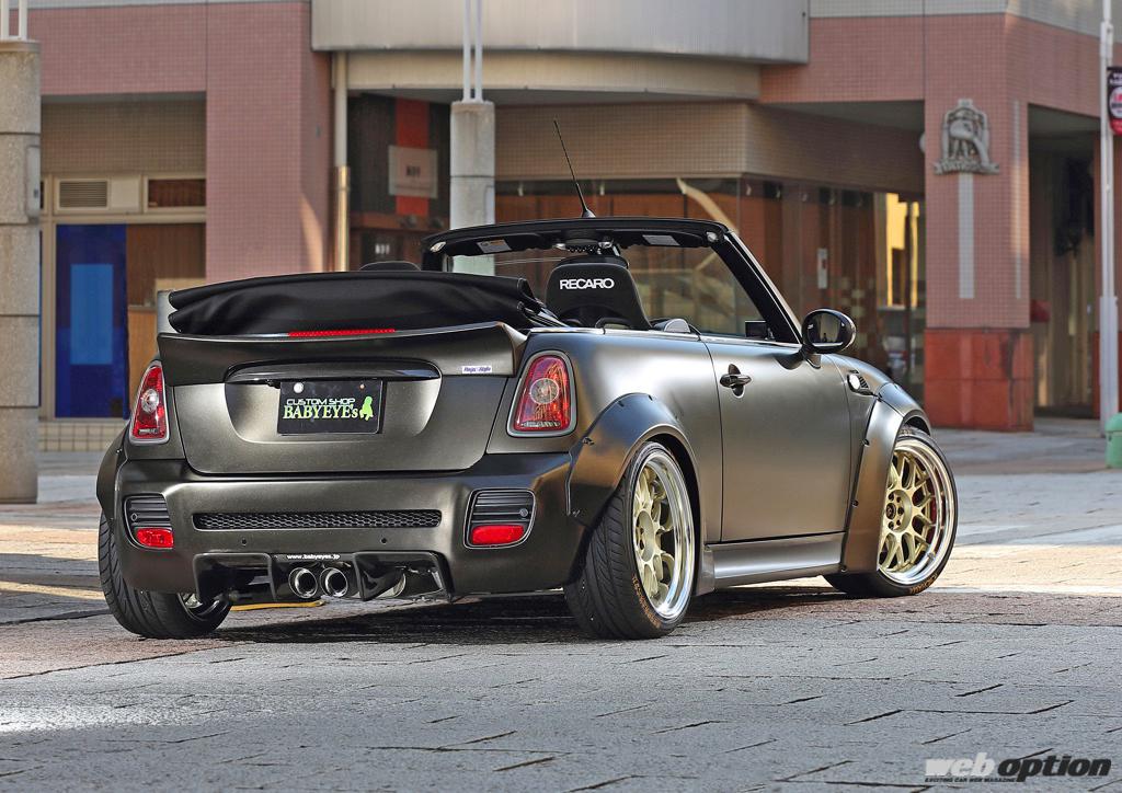 「このクルマはベース車探しからオーナーさんと一緒に考えて作った1台です。ミニと言うと、ポップでキュートなイメージでカスタムする人が多いですが、このクルマはLBパフォーマンス製のコンプリートボディキットを軸にワイルドなテイストを盛り込んでみました」とはベイビーアイズの中島代表。