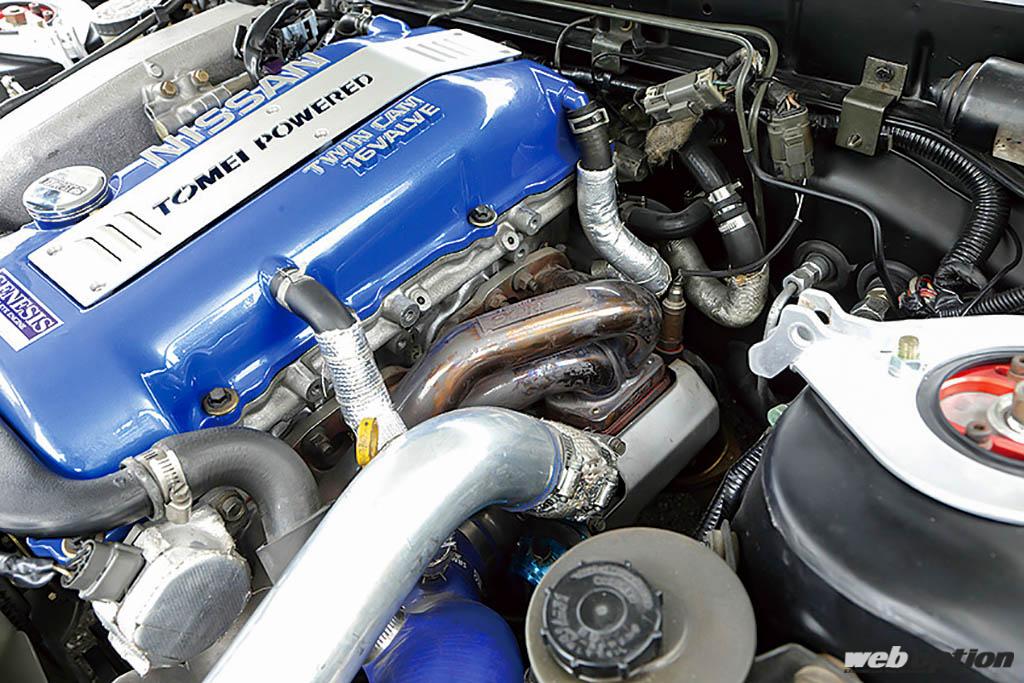 まずエンジンは、以前から所有していたというS15シルビアのSR20DETをスワップ。東名パワードのIN&EX256度ポンカムタイプR、カムギア、1.5mmメタルヘッドガスケット、ロッカーアームストッパーなどヘッドチューンを中心に一通り手の入った仕様だ。