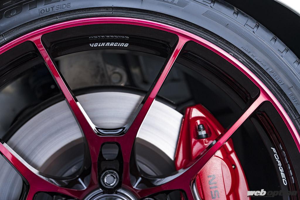 「スタイリッシュに仕上げたいけど、せっかくのスポーツカーだから走りも楽しみたい。そうしたユーザーさんにとって最適な1本が、ボルクレーシングG025。デザインを重視してホイールをチョイスすればドレスアップ感が強くなっていきますが、G025ならビジュアルだけじゃなくハイスペックも与えてくれますからね」とは、デモカーを持ち込んでくれたフジムラオートの藤村さん。
