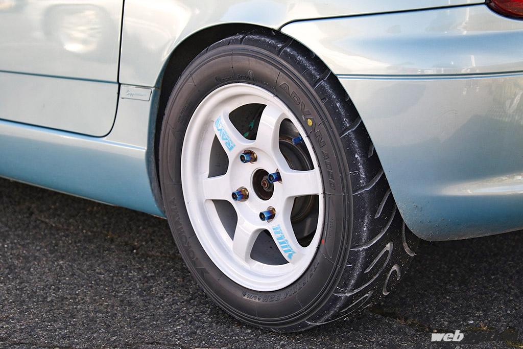 ホイールは前後共に14インチのボルクレーシングTE37。タイヤはフロントがエコタイヤで、リヤには185/60R14サイズのアドバンA050を履く。