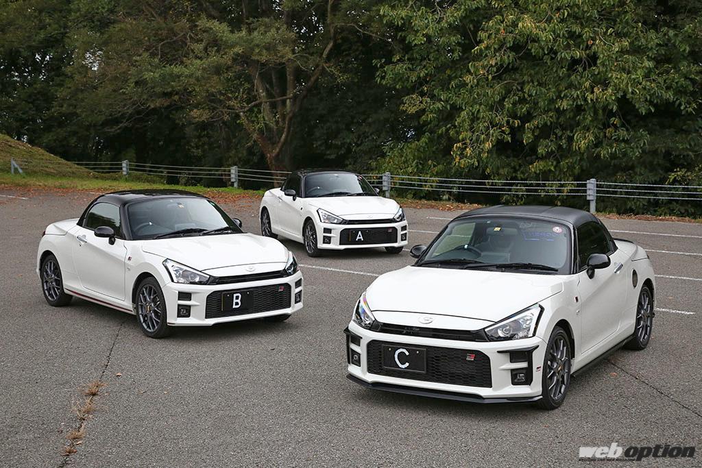 今回の企画は、そうしたTRD最新パーツが組み込まれた仕様違いのコペンGRスポーツ(A車:フルノーマル/B車:パフォーマンスダンパー装着/C車:エアロパーツ&パフォーマンスダンパー&アルミテープ装着)をターザン山田が乗り比べるというのがテーマだ。