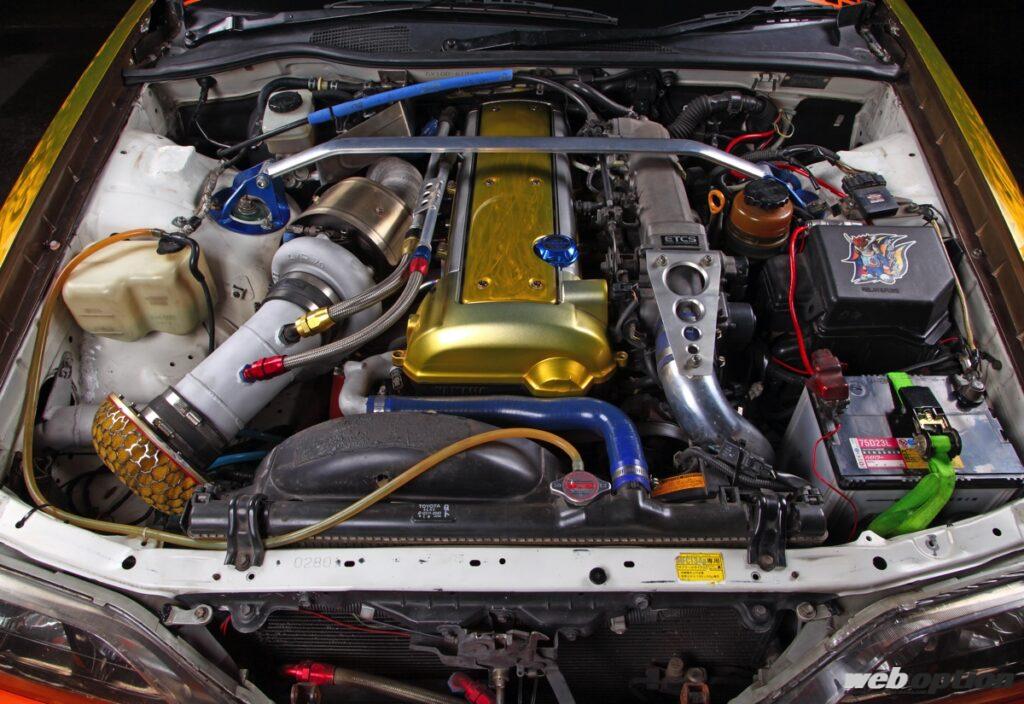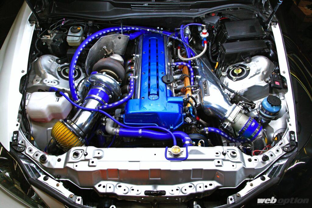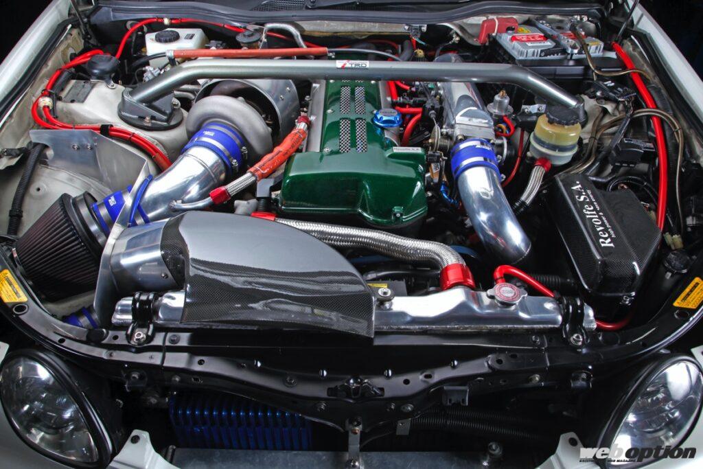 ドリフト業界に一石を投じたドリドレ仕様。心臓部は、2JZの腰下を流用した1.5J仕様にHKSのVカム(IN/EX264度)とTO4R改タービンをセット。F-CON Vプロで各種マネージメントを行い、最大ブースト圧1.5キロ時に526ps/74kgmを達成している。