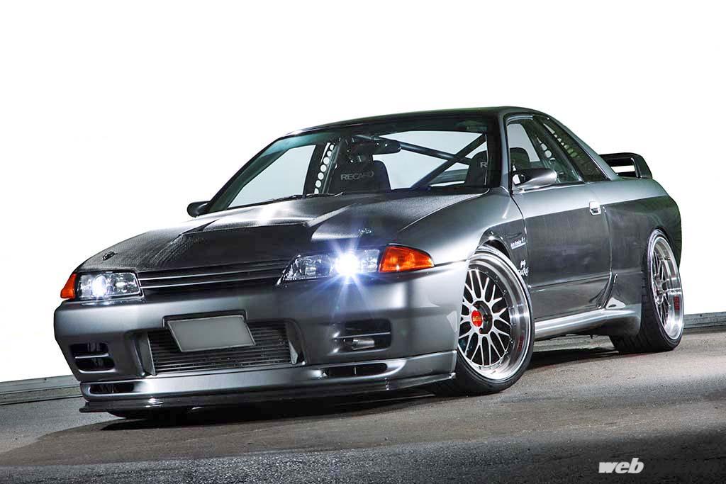 ゼロヨン8秒9、筑波57秒という記録を持つBNR32。パワーチューンは凄まじく、腰下はHKSのステップ3キットを使ったRB26改2.8L仕様とされ、そこにフルチューンヘッドとT51R SPL BBタービンを組み合わせることで、最大ブースト圧2.2キロ時に965ps/98kgmもの出力を弾き出す。