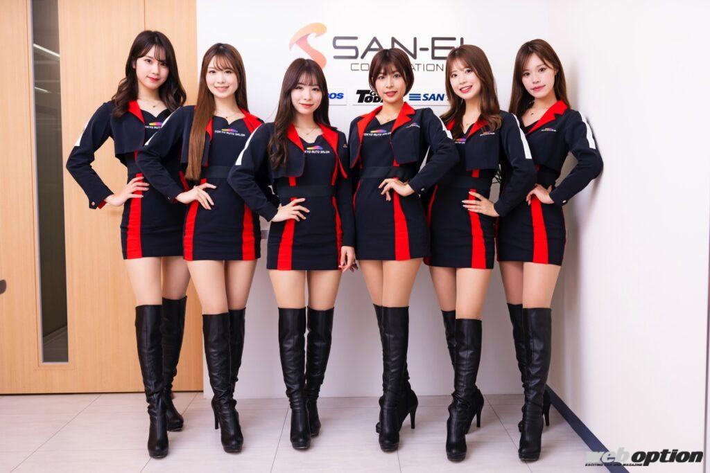 東京オートサロン2023イメージガールのA-class。メンバーは写真左から、長坂有紗さん、松田蘭さん、花乃衣美優さん、藤井マリーさん、朝倉咲彩さん、広瀬晏夕さんの6名だ。