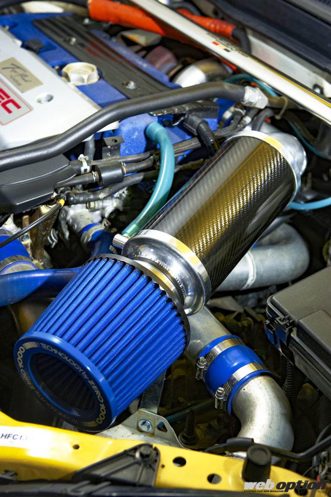 インテークにはZERO1000パワーチャンバーを装備。NAチューニングに向けたパーツではあるが、レスポンス重視のハイコンプターボだけに吸気流速の向上は大きな意味がある。また、この車両はバッテリーをリヤラゲッジに移設していることもあり、ドレスアップ効果も持たされているのだ。