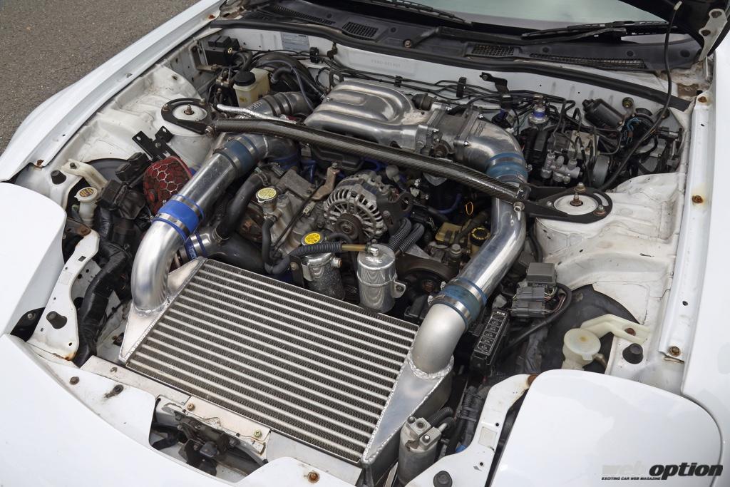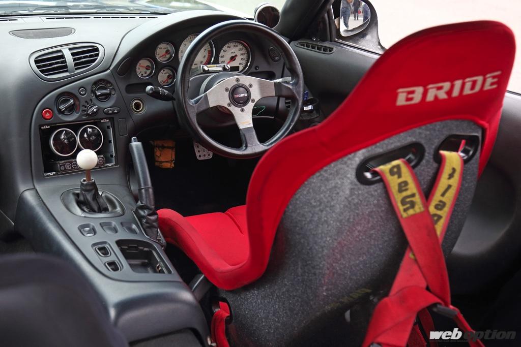 ブリッドのフルバケや追加メーターは装着しているが、ストリート仕様ということでその他はノーマル然としたインテリア。当然、内装パネルやエアコンも残している。