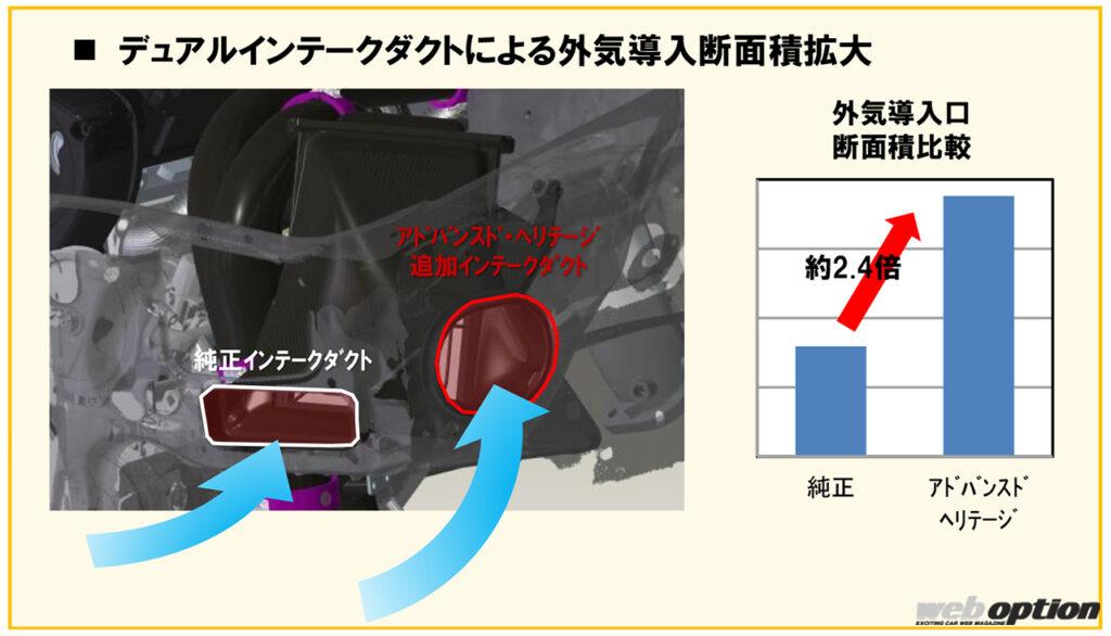 インダクションボックスは、吸気温度の低減を狙って純正同様のクローズドレイアウトを採用。内部フィルターは純正から6パーセントの容量アップを果たした専用品だ。また、外気導入口もデュアル化して断面積を2.4倍まで広げている。