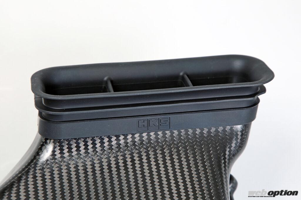 驚くのは、ゴムのダクト部まで型を起こして製造していること。しっかりとロゴが刻まれ、HKSの強い拘りが感じられる部分だ。
