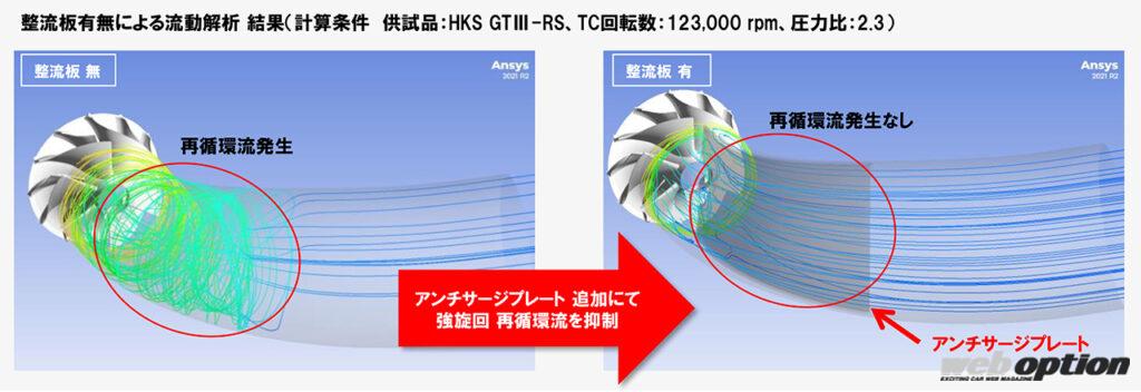 従来の対策手法であるタービンのポーテッドシュラウドに対して、この仕様は高流量域でのコンプレッサー効率低下もない。まさに最強のサージング防止装置なのである。