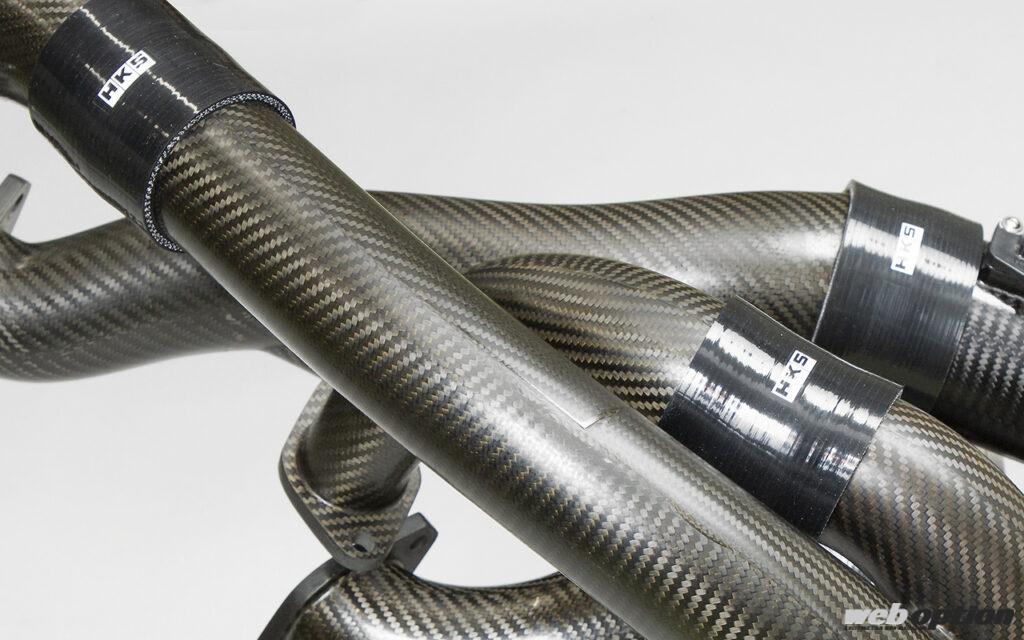 素材はドライカーボンだが、部位によって含有する樹脂を変えているのがポイント。「一般的なドライカーボンはエキポシ系の樹脂を使うのですが、耐熱温度が120度くらいなんです。それだとタービン付近では耐えられないので、350度対応のシアネートエステル系の樹脂を使っています」とは開発担当のHKS中島さん。