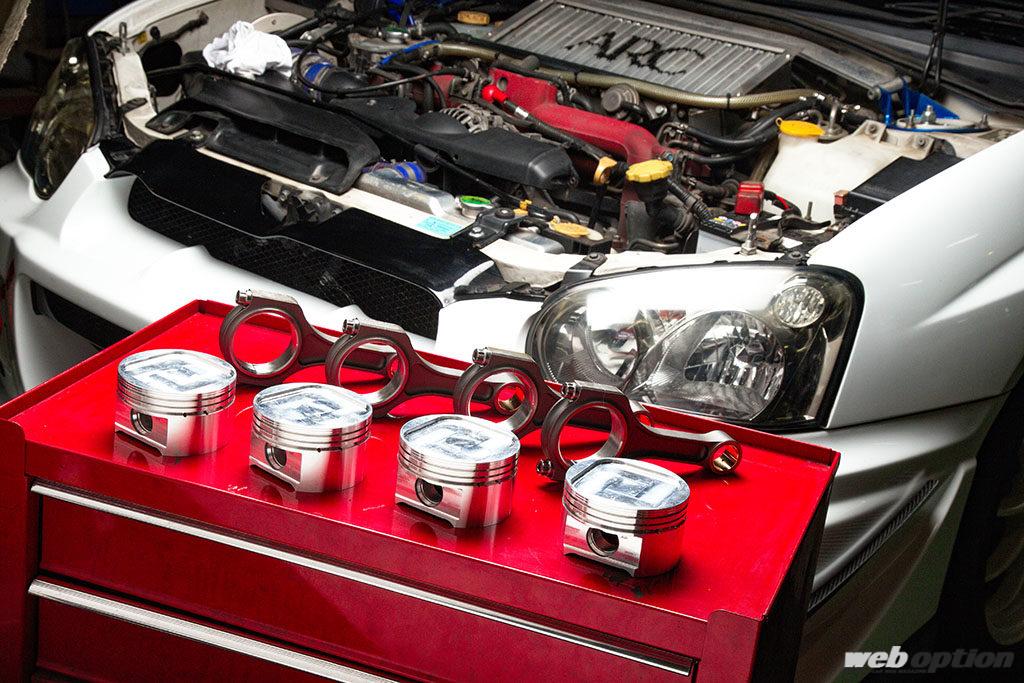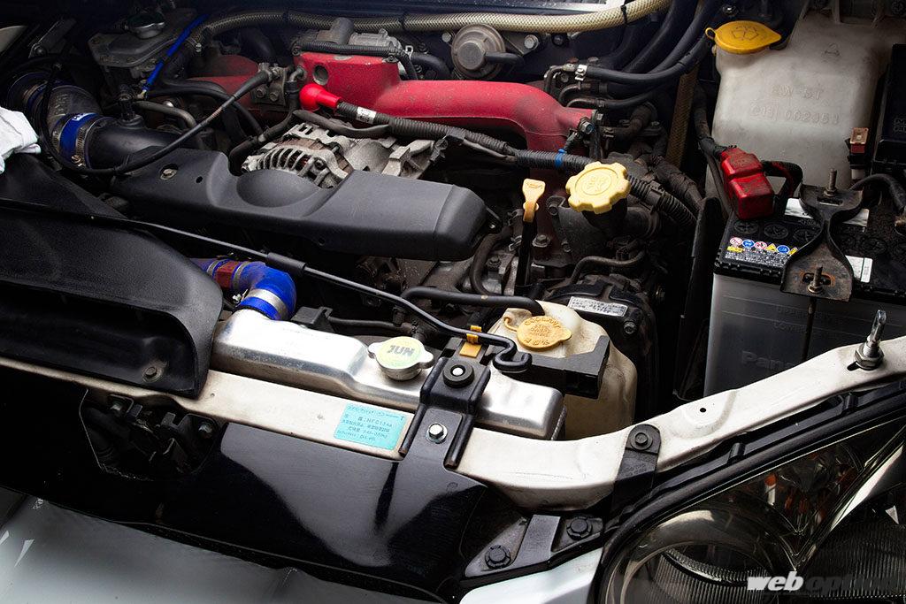 EJ20の耐久性を考えると、腰下の強化が必要になるのは400psオーバーから。この車両のように、350ps前後ならばエンジンノーマルでも問題はないが、JUNでは走行距離の伸びた個体には各部のリフレッシュも兼ねた排気量アップを勧めている。