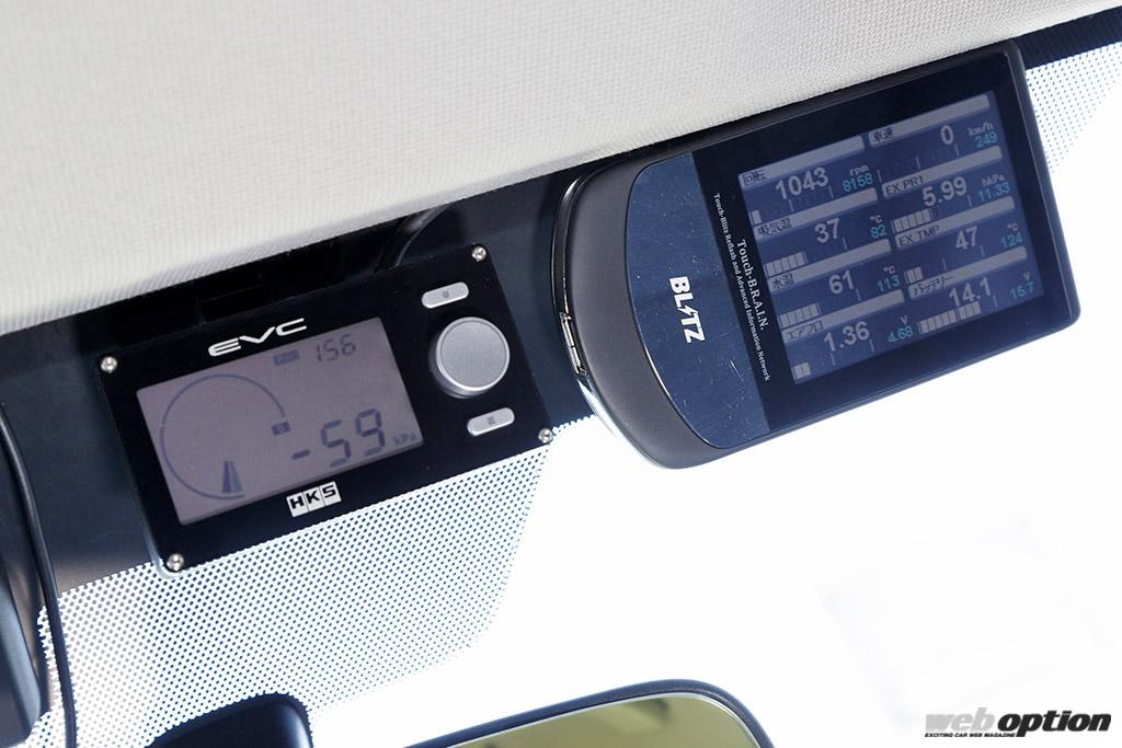 ブースト制御を司るEVCとブリッツのタッチブレインはルームミラーの基台部にマウント。見やすくて視界の邪魔にならない工夫がなされている。